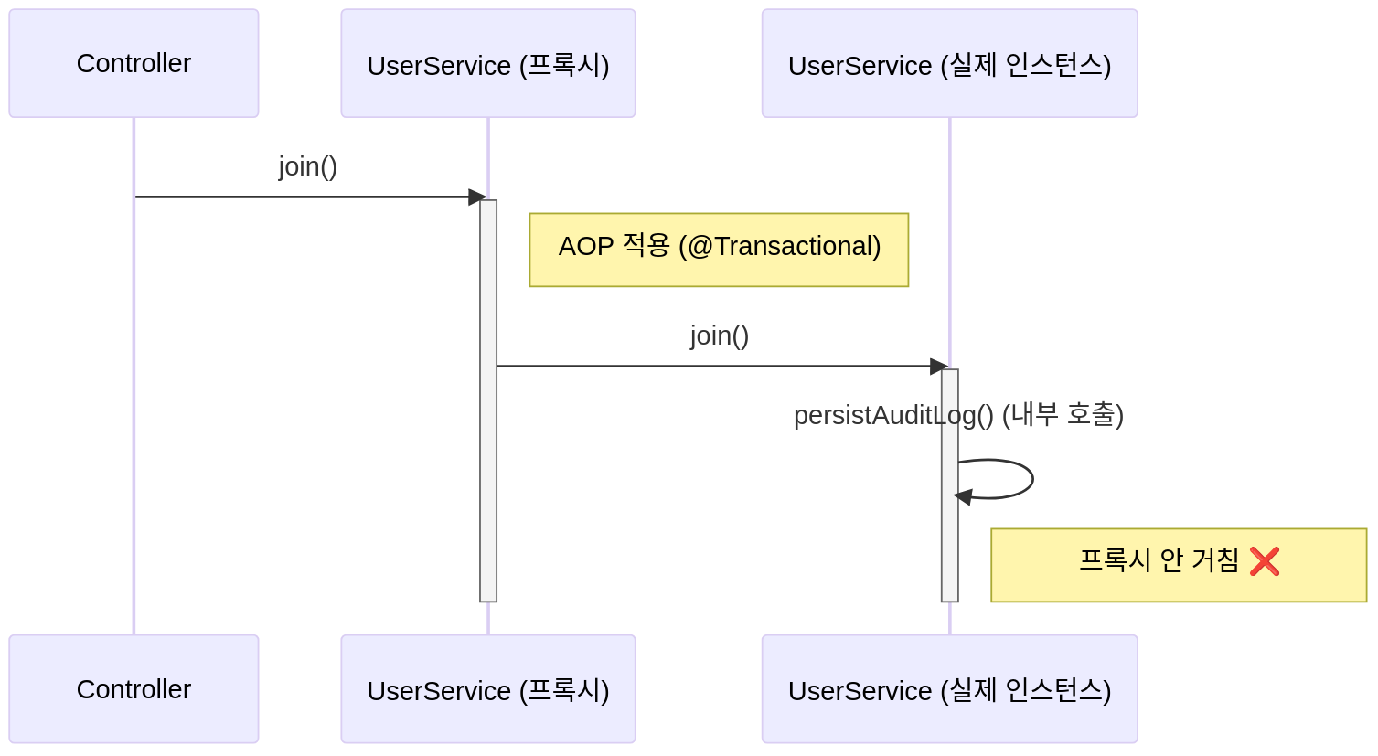 - persistAuditLog()는 같은 클래스에서 직접 호출했기 때문에 프록시가 가로채지 못함.